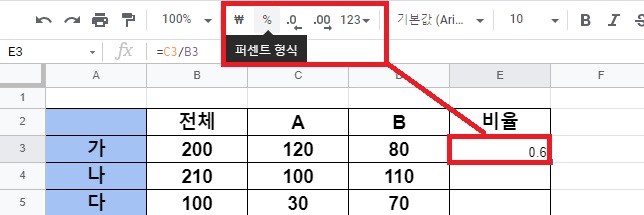 백분율 구하는 수식 적용하기