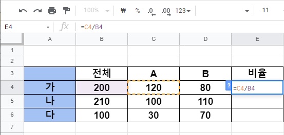 하나의 셀에 값을 계산은 했는데,나머지 나,다의 각 전체 값중에서 A가 차지 하는 비율은 어떻게 확인 할까요? 일일이 하나씩 수식을 입력해줘야 할까요? 결론을 얘기하면 그럴 필요는 없습니다.
